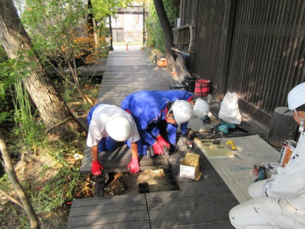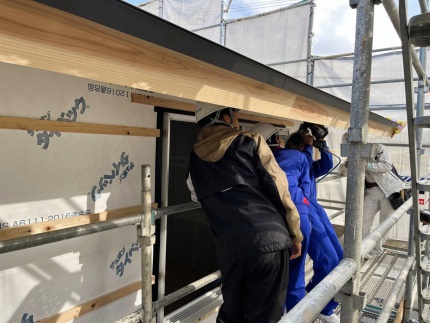 住宅の現場では、大工さんに教わりながらエアタッカーを使って軒天材を留める作業に挑戦。