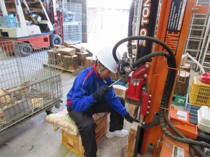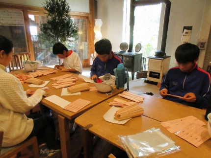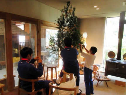 落ち葉掃きや薪づくり、デッキの補修などの外作業に加え、薪ストーブのそばで大黒箸の袋詰めやクリスマスツリーの飾り付けも体験。