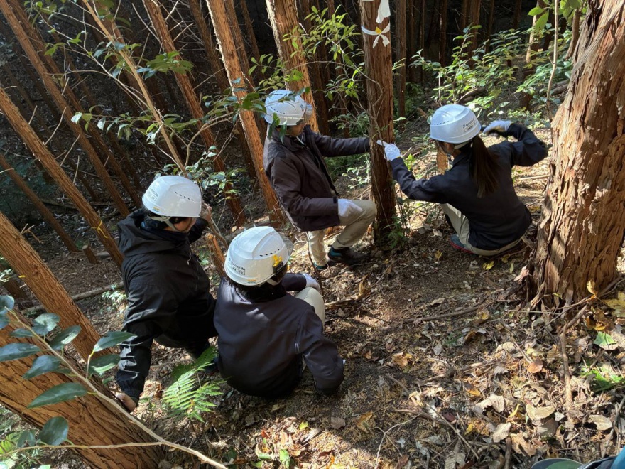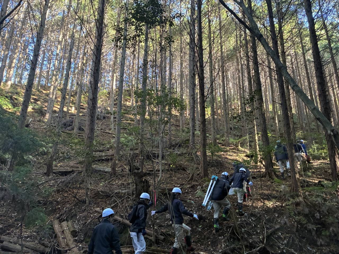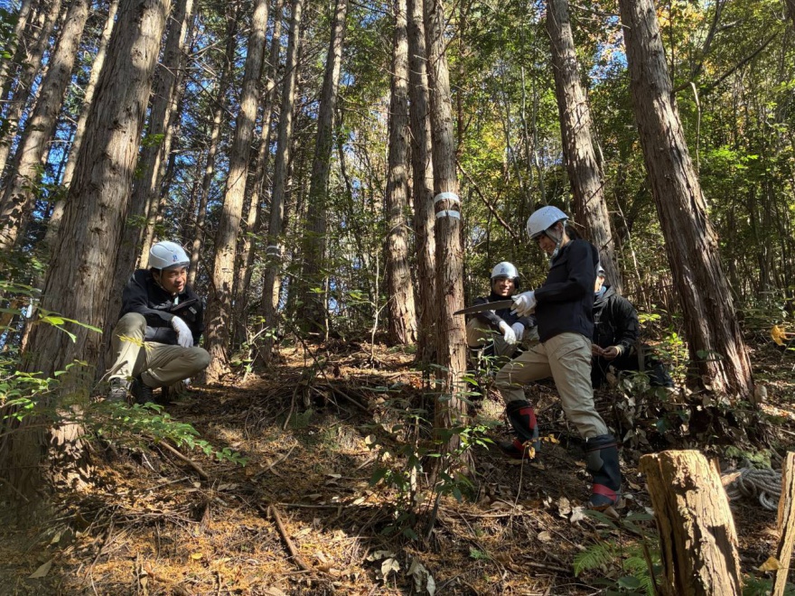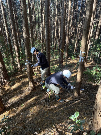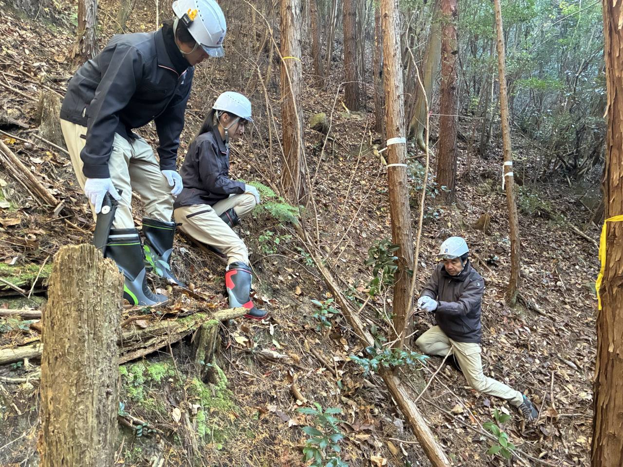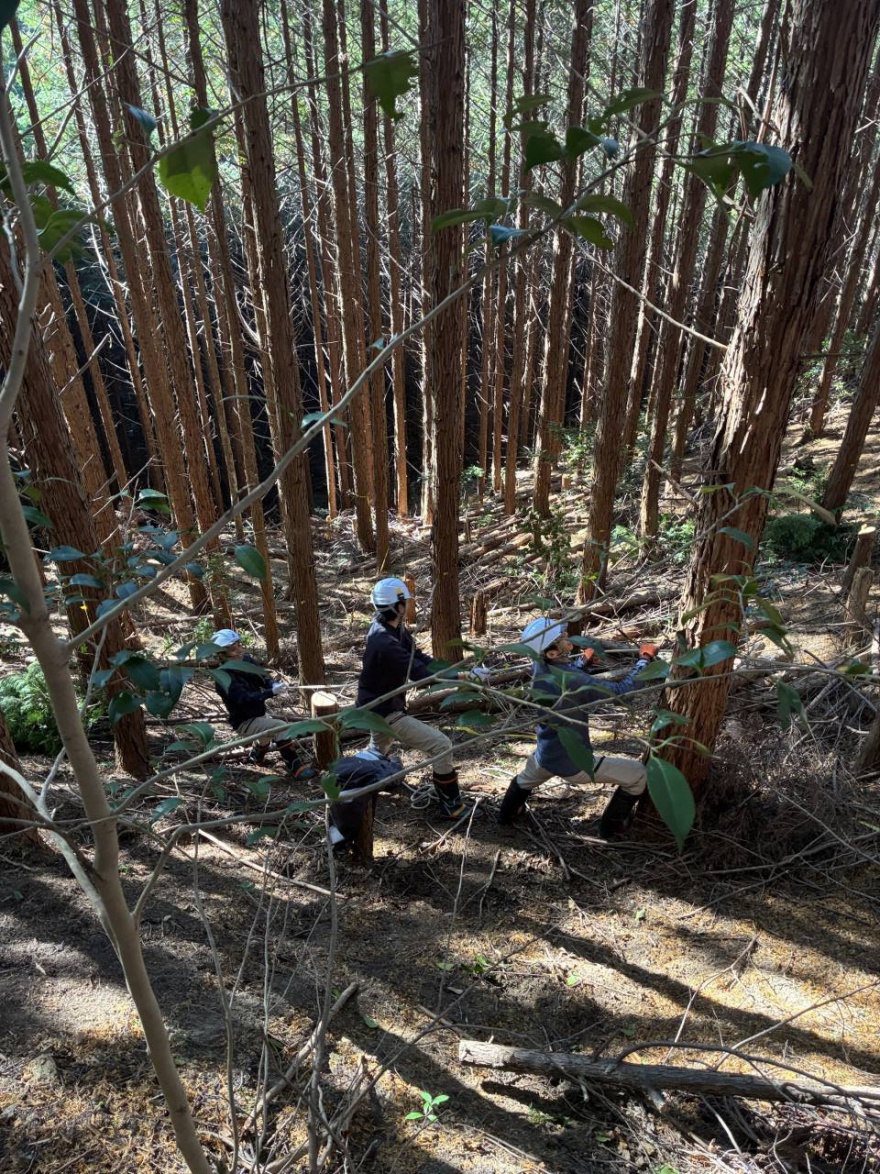 私自身も今年で4回目の参加となります。作業エリアに向かう道中では、これまで間伐を行ってきた場所を通りますが、日光が地面まで届き、下草や苔の生えている姿を見ると、山が確かに健康を維持できていることを実感できます。