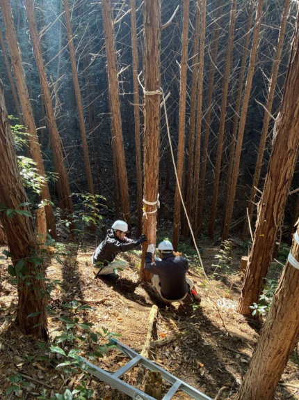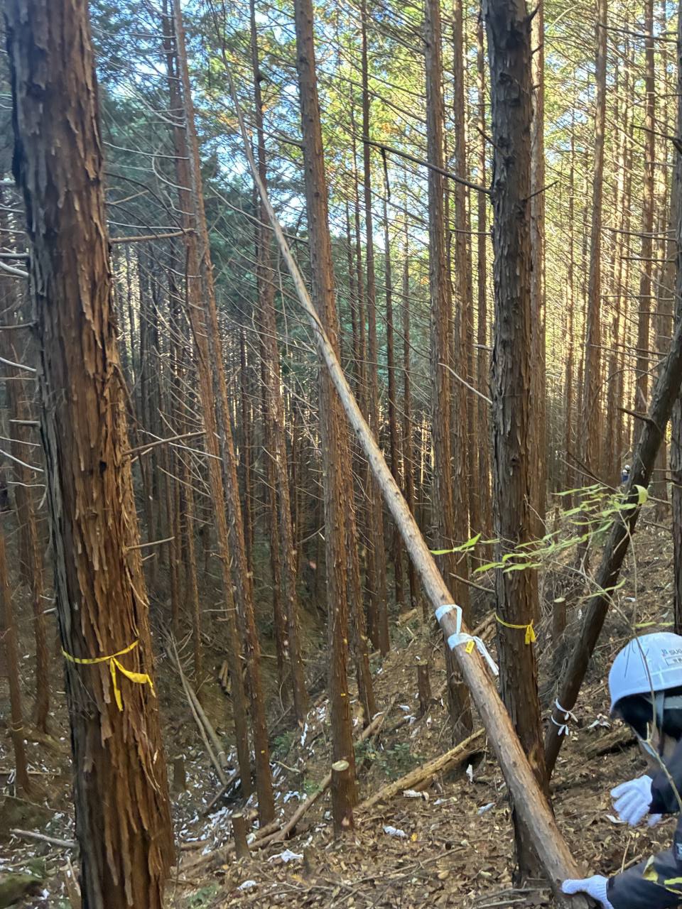 また、枝が伸びて木同士の距離が近くなっているため、切っただけではほぼ必ず「かかり木」になってしまいます。ロープを幹にかけ、「せーの!」の掛け声で皆で引っ張り、隣の木から外して倒していくのですが、跳ね返りや転倒の危険もあるため慎重さが求められます。上から降ってくる落ち枝も侮れず、ヘルメットは欠かせません。