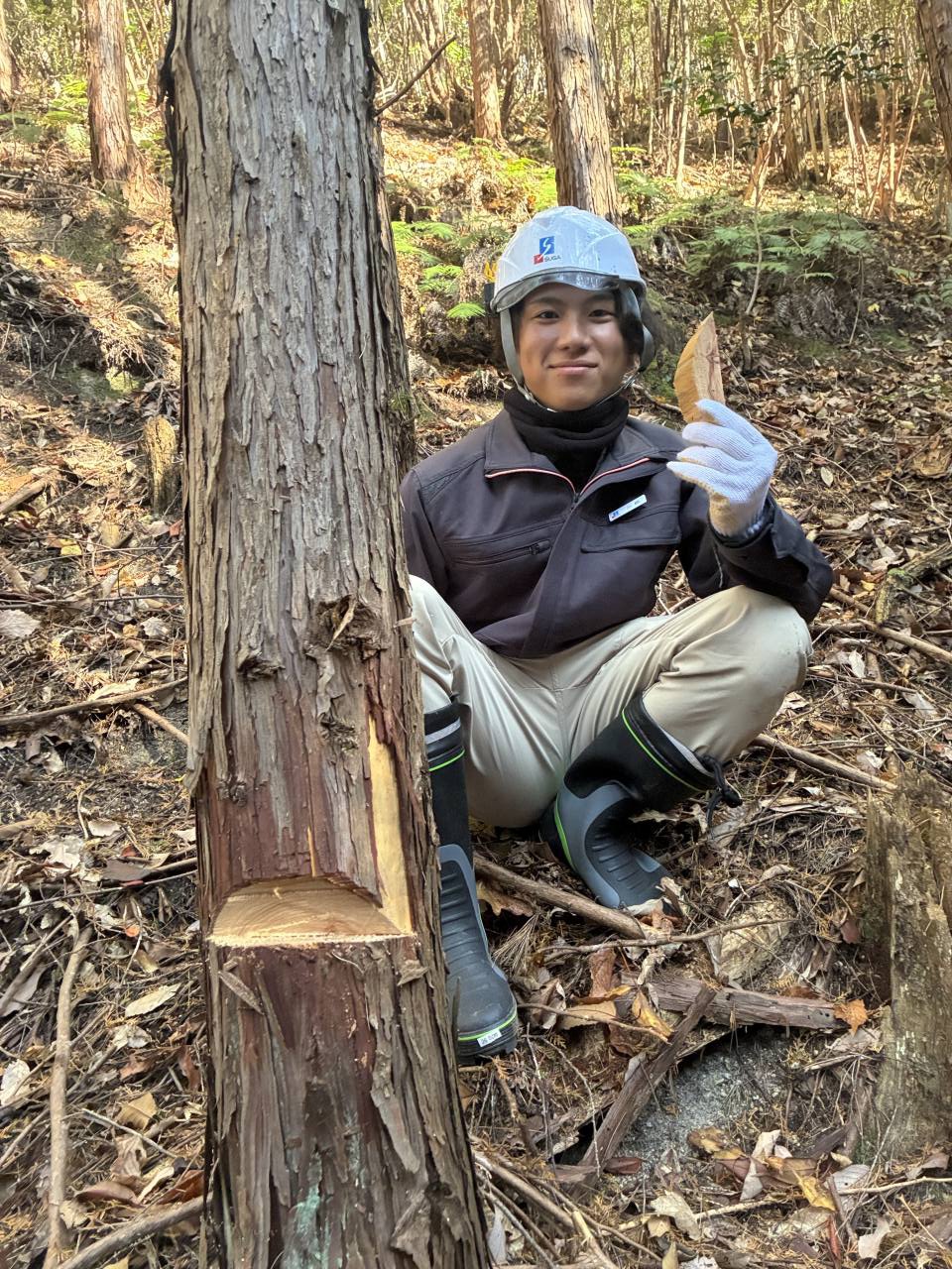 今回、森林伐採に参加させていただいて自然の豊かさを感じさせてくれるすごくいい経験になりました。木を伐採するのは初めてで、思ったより硬く一つの木を切るだけでかなり疲れました。ただ経験者の方に教わりながら何人かで協力しながら楽しく伐採を行うことができました。(建築:長船)